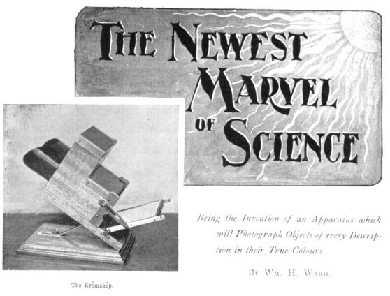 The Krõmskõp and Kromograms can be obtained from the manufacturers, 121, Shaftesbury Avenue, London, but the camera is complicated, and will not be obtainable just yet. When certain difficulties in its construction have been overcome, simplifying its operation, and making it possible to produce the camera at a popular price, careful amateurs will be able to make their own colour photographs, and a new pleasure will at once be attainable by all who are familiar with ordinary photographic manipulation.