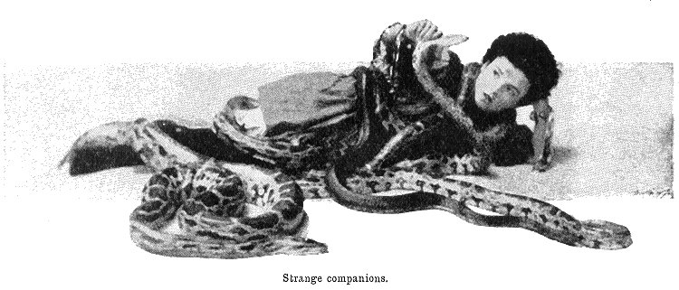 Snakes in captivity evince much intelligence, and their tameness is in no small degree a lively sense of favours to come. They soon appear to realise that from their trainer alone is to be expected not only food, but what is in more constant request, the warmth which is essential to their existence. They must be kept in a temperature of from 70o to 80o, and this is effected by wrapping them in blankets surrounded by hot-water pipes.
