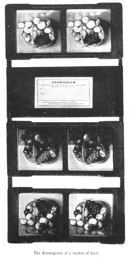 The cylinder must be placed in the phonograph before the sound recorded can be reproduced, the ribbon with its myriad images must pass through the Kinetoscope in order to visually reproduce the moving scene, and in like manner the Kromogram must be seen in the Krõmskõp in order to reproduce in colour the object photographed, which it does so perfectly that all suggestion of photography vanishes, and the object itself, be it flowers, fruit, portrait, landscape, or a work of art, seems to be actually before the eyes.